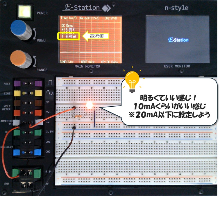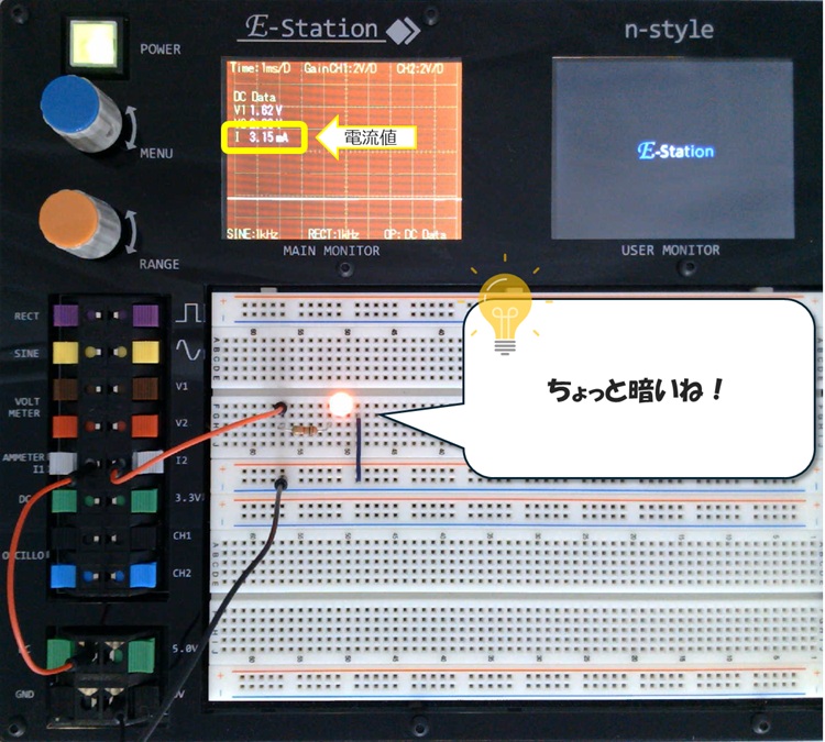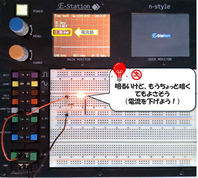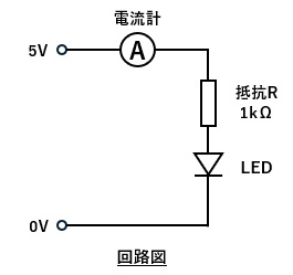 1.抵抗Rの値を1kΩを基準に、100Ω・300Ω・10kΩに変更し、LEDの光り方と電流の変化を観察します。