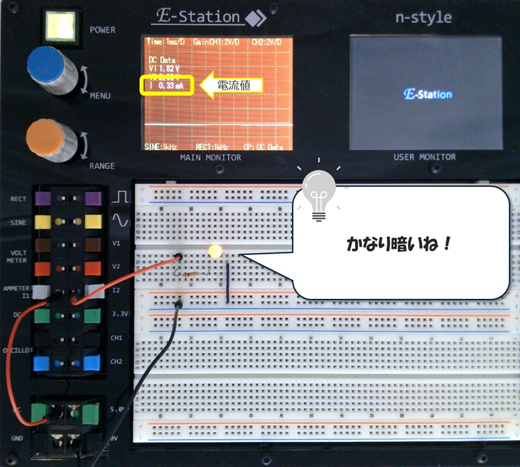 またLEDの極性を逆に配線すると、電流が流れずLEDが光らないこともわかりました。