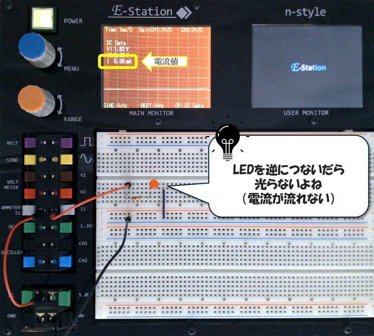 2.LEDには極性(短い方がマイナス極、長い方がプラス極)があるので、極性を逆に配線した場合にどうなるかを観測します。