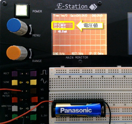 今回は新品のアルカリ乾電池を使用し、電圧計V1の測定値は1.60Vでした。