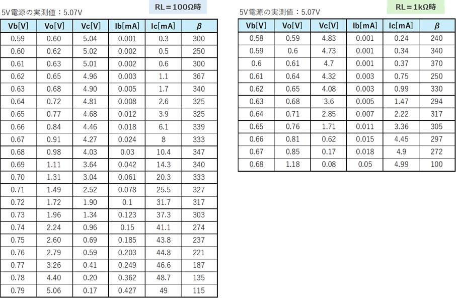 ベース電流は非常に小さいので、測定誤差の影響を受けていますが、概ねコレクタ電流が変化しても一定(グラフでは水平)、かつ抵抗RLを変えても概ね同じ値であることが分かります。