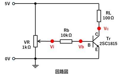 その際にベース電圧Vbの変化とともに、半固定抵抗端電圧Viとコレクタ電圧Vcを記録します。