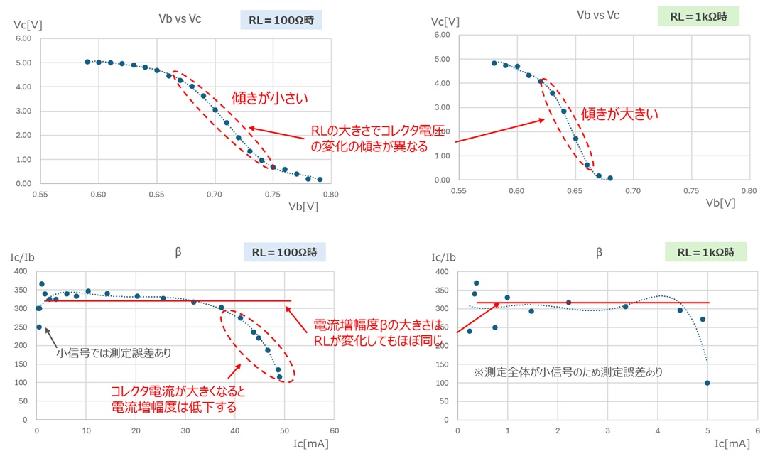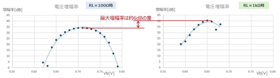 動作点(ベース電圧Vbやベース電流Ibをどこに設定するか)により電圧増幅率が変化しています。また抵抗RLが大きい方が電圧増幅率が高いことも分かりました。