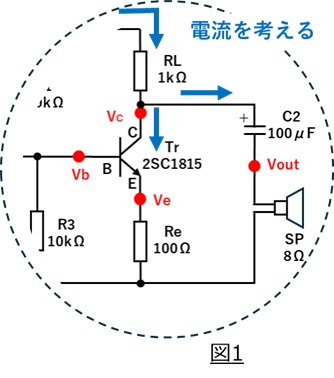 コンデンサC2がありますので、直流成分はスピーカー側へは流れません。そのため、直流成分であるバイアス電流はすべてトランジスタ側に流れます。(動作点は変わらない)